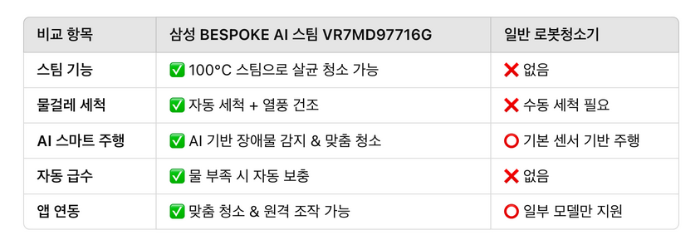 삼성의 BESPOKE AI 스팀 VR7MD97716G는 기존 로봇청소기와 차별화된 스팀 물걸레 살균 기능을 탑재한 최첨단 AI 로봇청소기입니다. 고온의 스팀으로 바닥을 살균하면서 닦아주고, 청소 후에는 물걸레를 자동으로 세척하고 열풍 건조까지 진행해 위생적인 사용이 가능합니다.